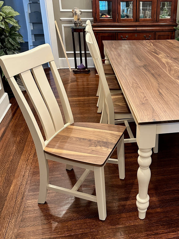 - The second photo features the Ava chair with a custom painted frame and a solid walnut seat.