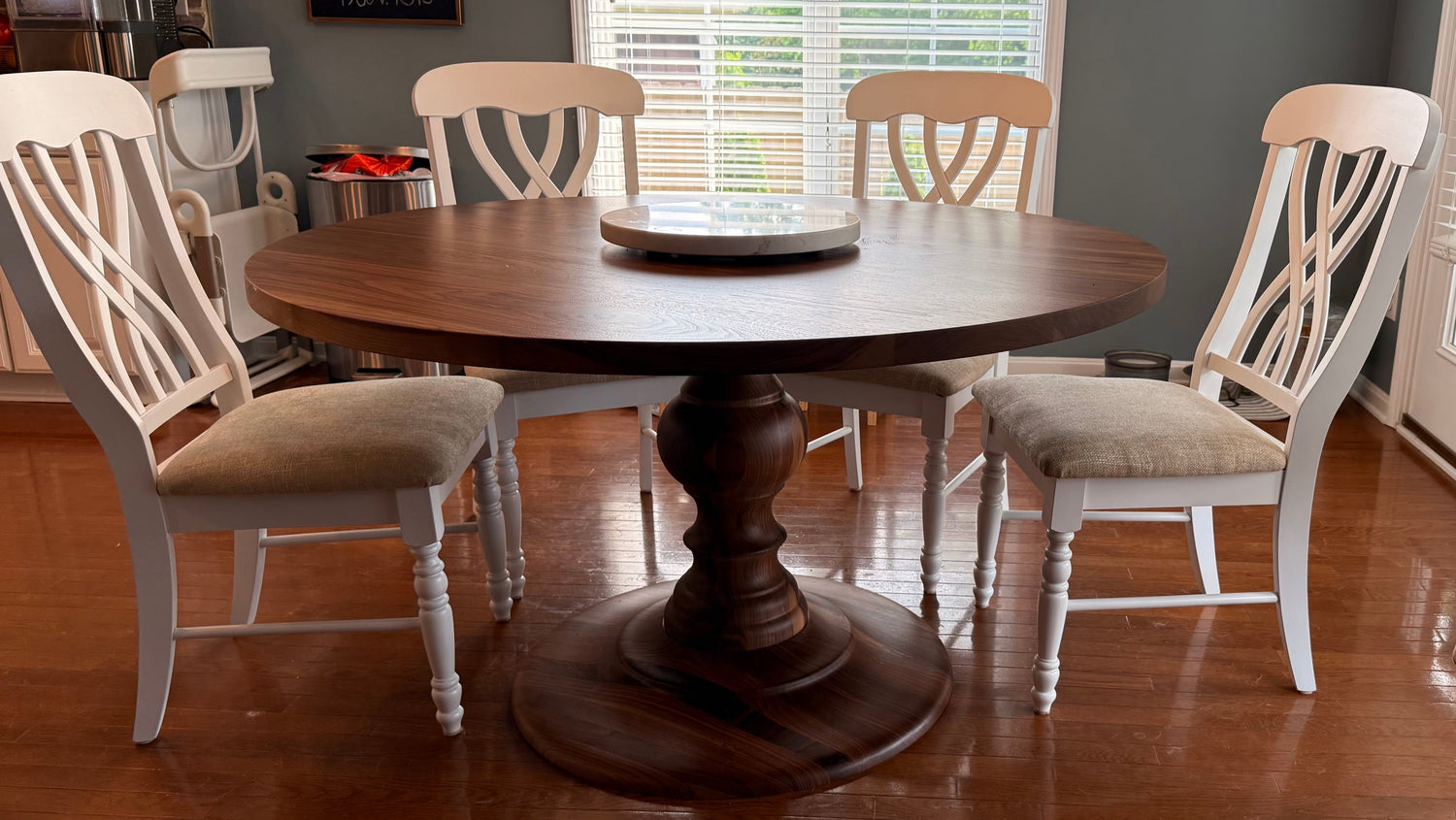 - The fourth table is also featured in solid walnut with custom upholstered Lattice Back Farm chairs.
